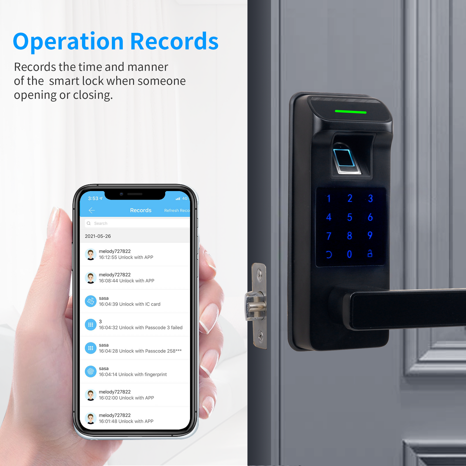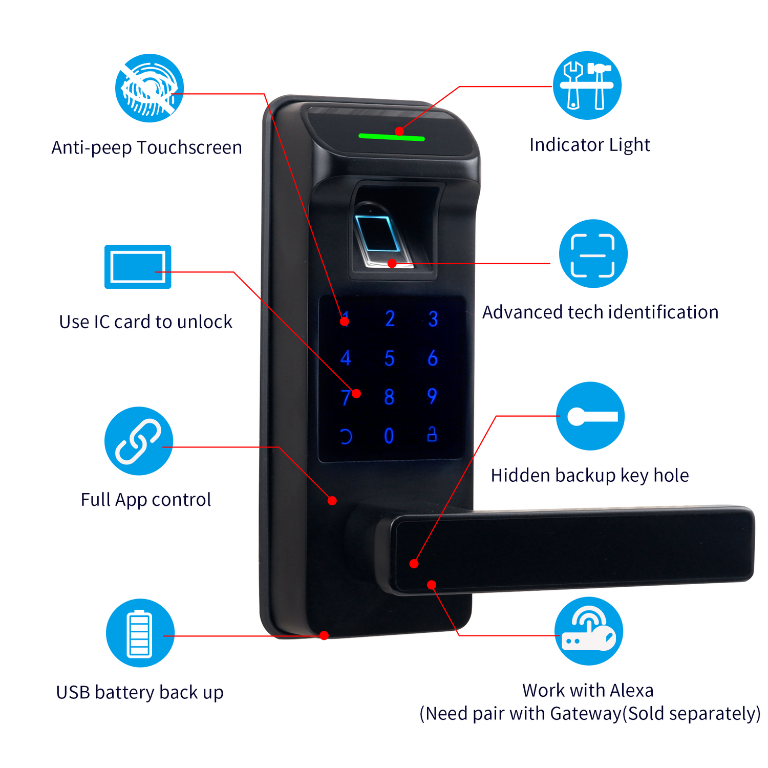 - [5 in 1 Smart Door Lock] 5 unlock ways : Fingerprint + Passcode + IC Cards + APP Control + Physical Keys. Fingerprint door lock support remotely unlock and work with Alexa/Google Assistant support voice control (Need to pair with gateway, sold separately)