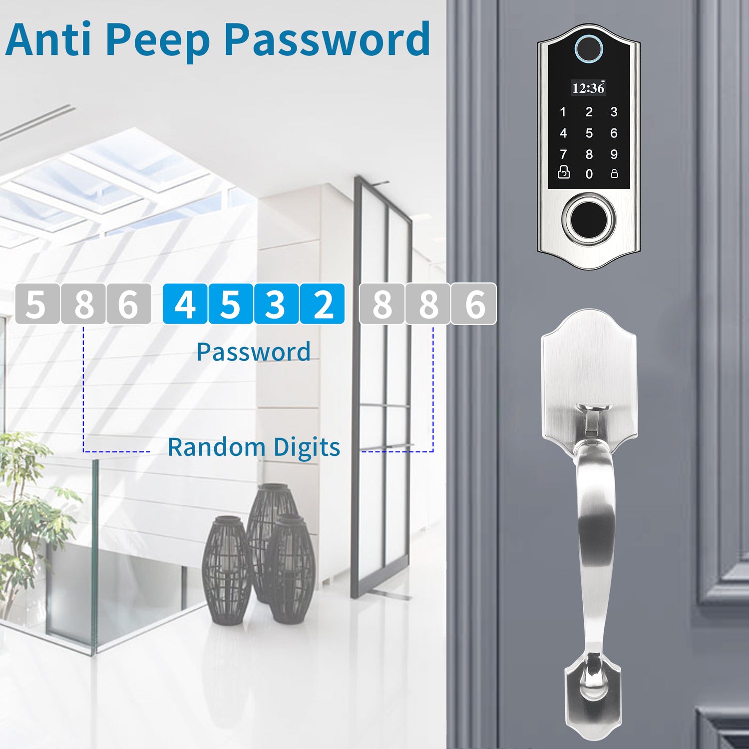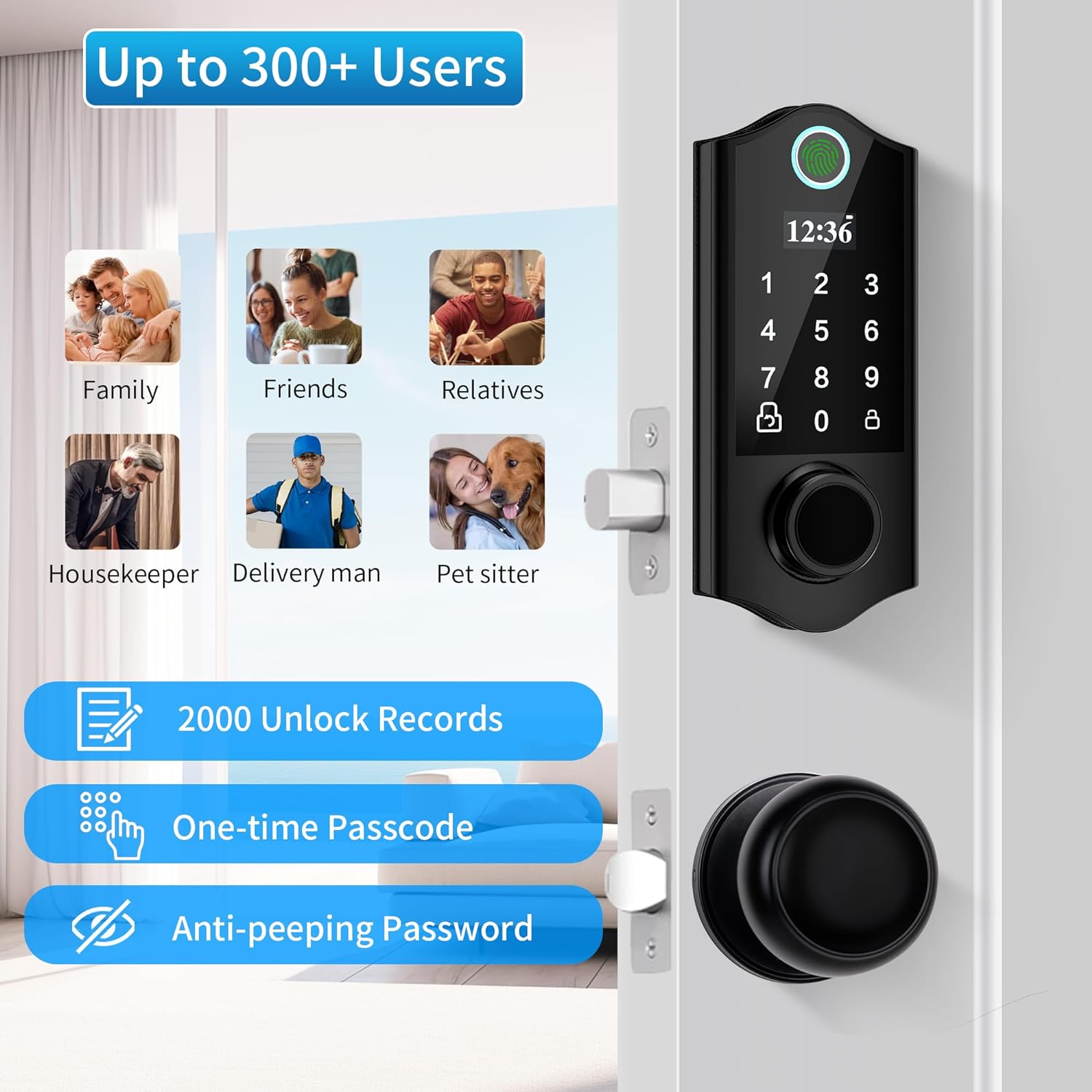 - [Muti-function Keypad Deadbolt] Up to 300 users, One-time Password for your housekeeper, Anti-Peeping Password which add random digits before or after the real passcode to confuse peeking. This door lock with keypad is featured with Low Battery Alarm, Mute Mode, 2000 Unlock Records, Emergency Usb Power Port to apply your needs.