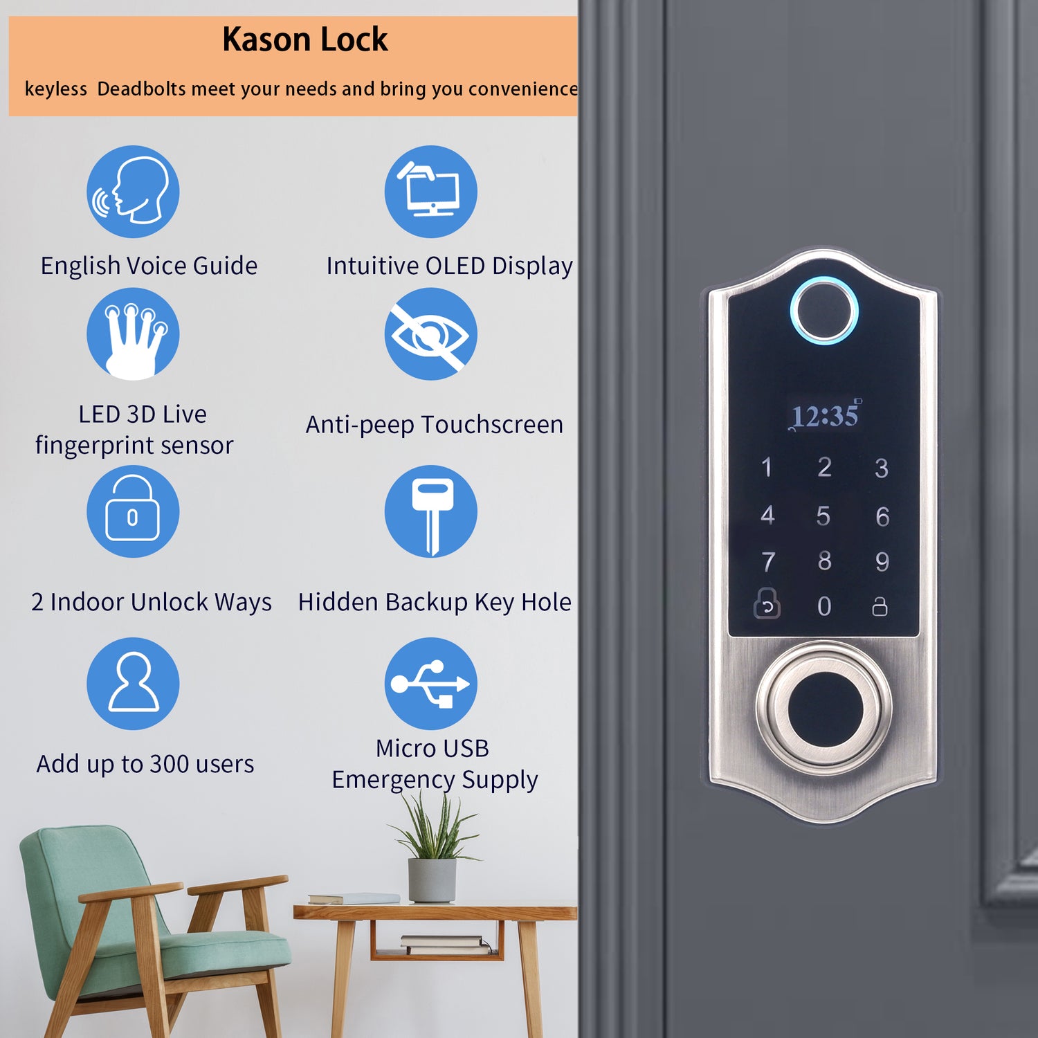 - [Advanced 3D Tech Fingerprint] Kason Fingerprint Door Lock recognizes your fingerprint within 0.3 seconds. Recognition accuracy rate is up to 99.9%, the lock will unlock your door within 1 second. 4 unlocking ways: Fingerprint + IC Cards + Passcode + Backup Key. Bring you a convenient & safer lifestyle.