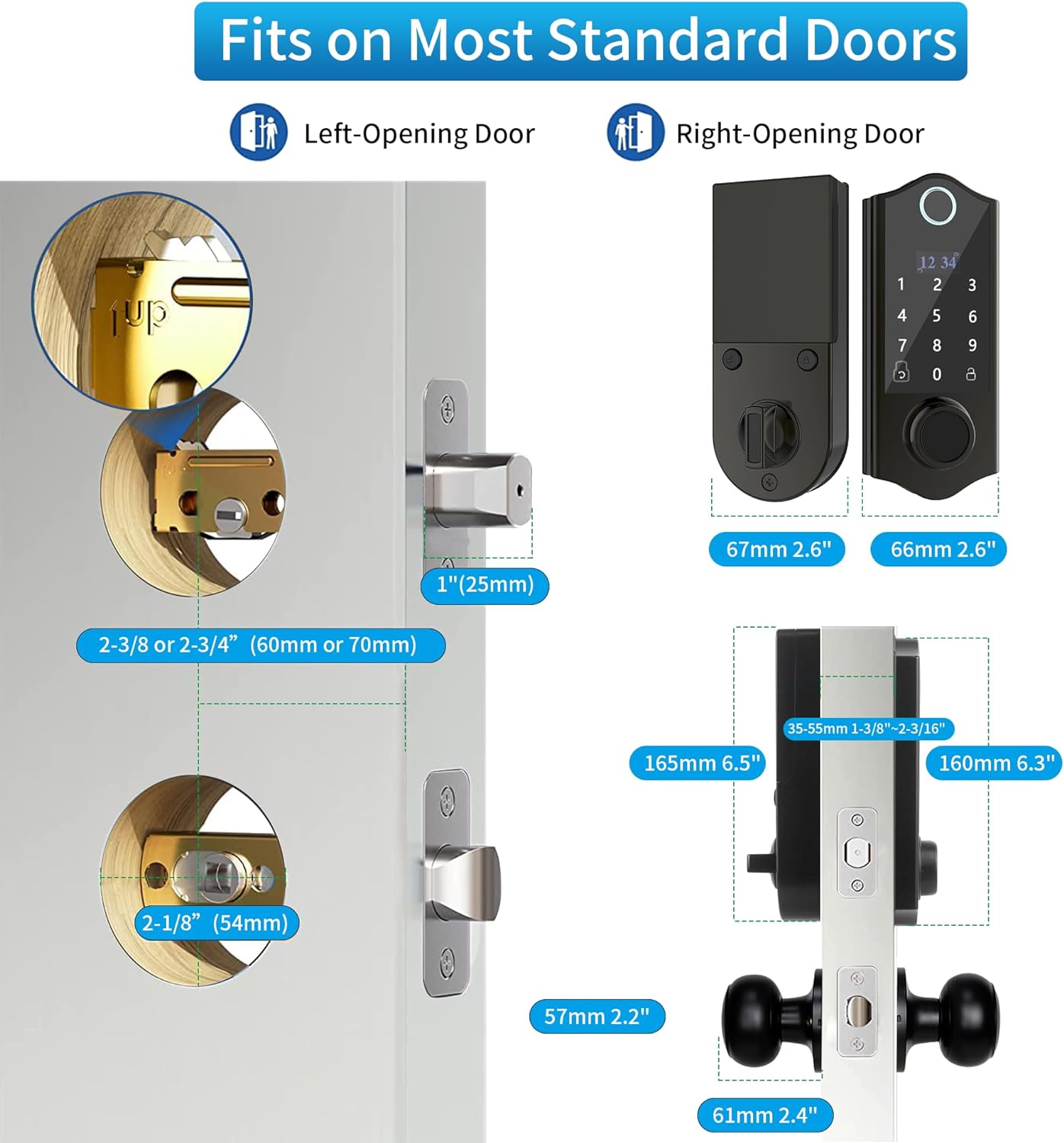 - [Suitable for Left & Right Door] Our Smart Keypad Deadbolt Lock meet your needs. Suitable for both left-handed and right-handed doors. Just adjust the Rotary Knob and “L/R Button”to fit left-handed & right-handed door. Suitable Door Thickness Range: 1 3/8 inch to 2 3/16 inch 35mm-55mm thick.