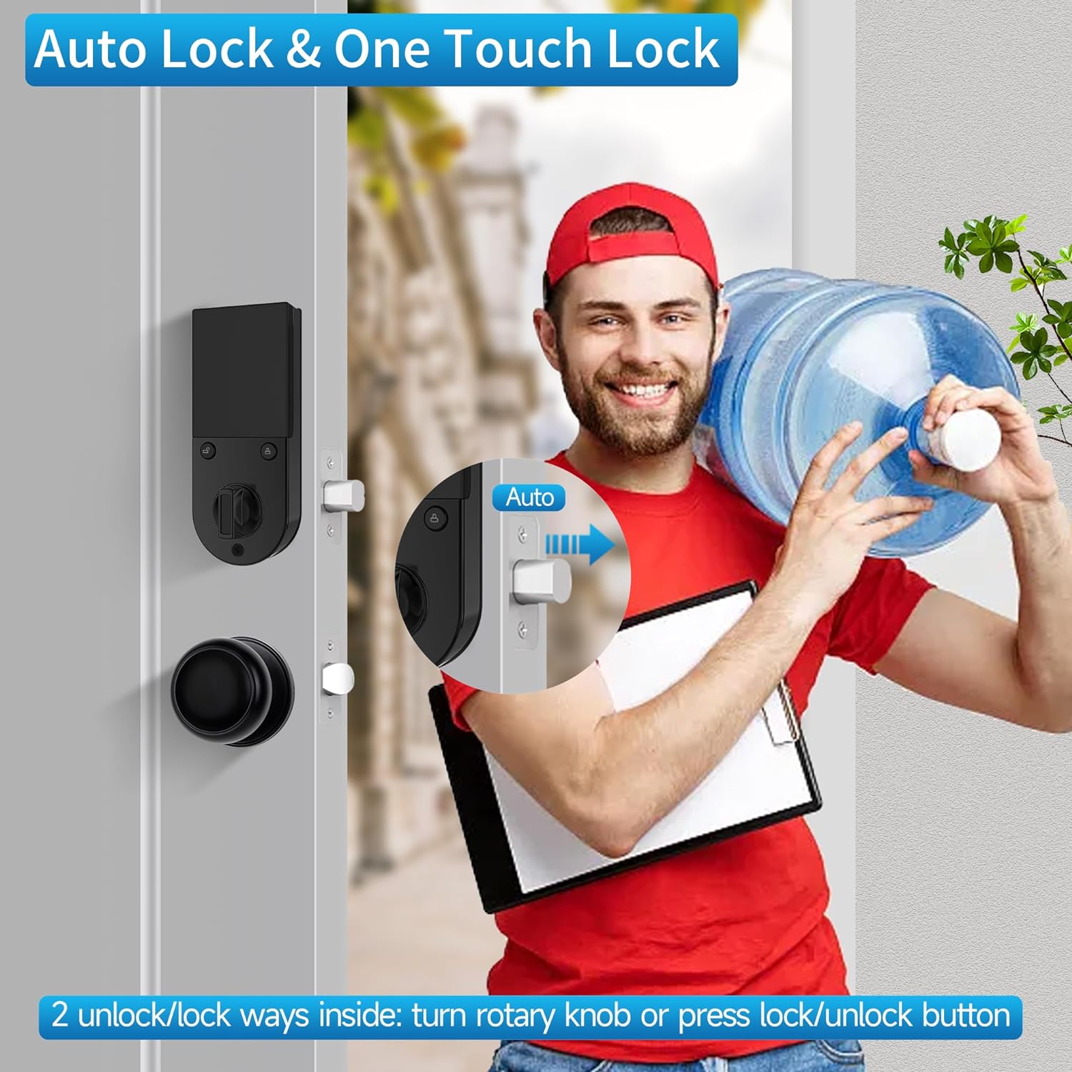 - [Auto-Lock & One-touch Lock] This keyless entry door lock can set to be locked automatically in 5/10/15/30 seconds, auto-lock will lock it for you. If you turn off the auto lock, just press the lock button to lock. Inside the door, there are 2 ways to lock/unlock the door: Turn the rotary knob or press lock/unlock button.