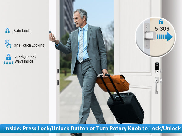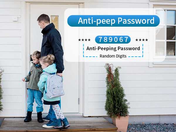 - [Auto Lock & Anti-peeking Password] Never forget to lock your door. The fingerprint lock can set to be locked automatically in 5/10/15/30 seconds after the door closed. Add random digits before or after your ture password to confuse someone want to peep.
