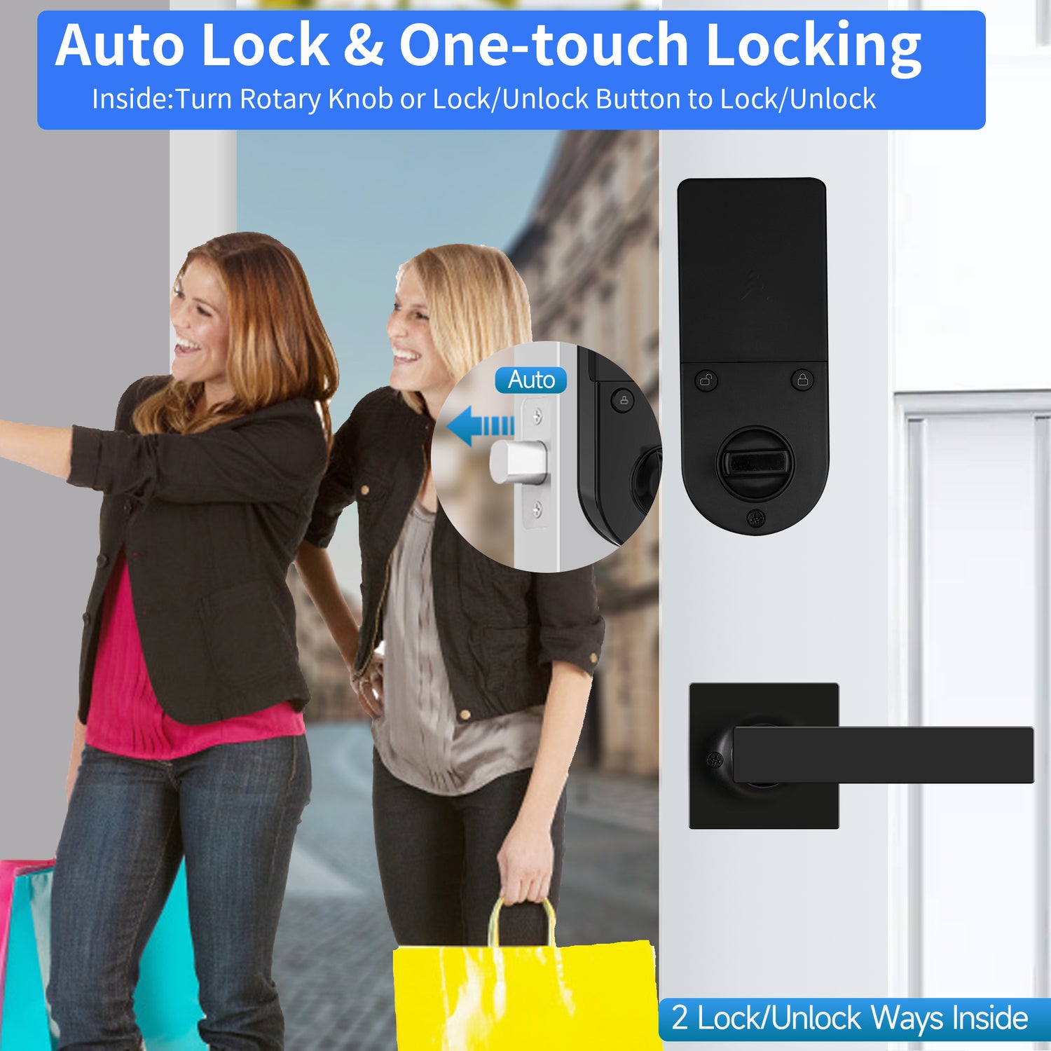- [Auto-Lock & One-touch Lock] Set up front door lock set to 'auto lock' in 5/10/15/30 seconds, or press the lock keypad button to lock the door. There are 2 unlock ways inside: Press lock/unlock button or turn the rotary knob.